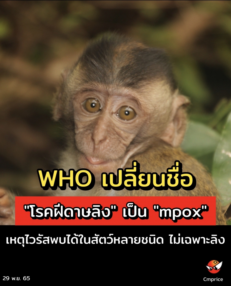 | • WHO เปลี่ยนชื่อ "โรคฝีดาษลิง" เป็น "mpox" เหตุไวรัสพบได้ในสัตว์หลายชนิด ไม่เฉพาะลิง |