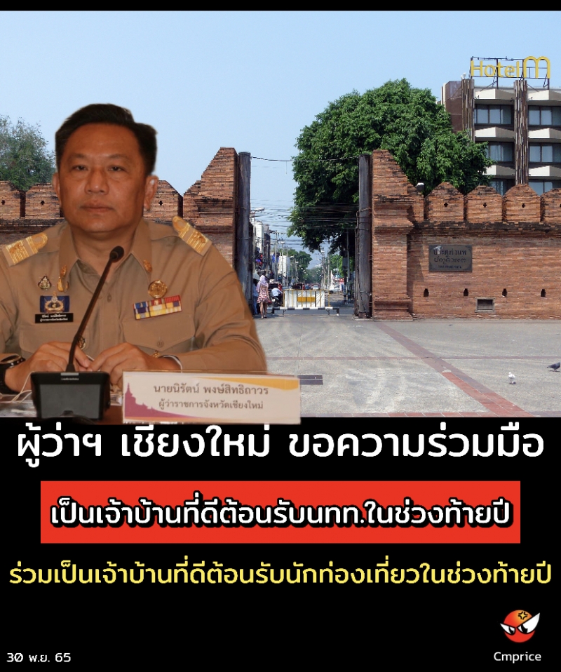 | • ผู้ว่าฯ เชียงใหม่ ขอความร่วมมือส่วนราชการและประชาชนร่วมเป็นเจ้าบ้านที่ดีต้อนรับนักท่องเที่ยวในช่วงท้ายปี |