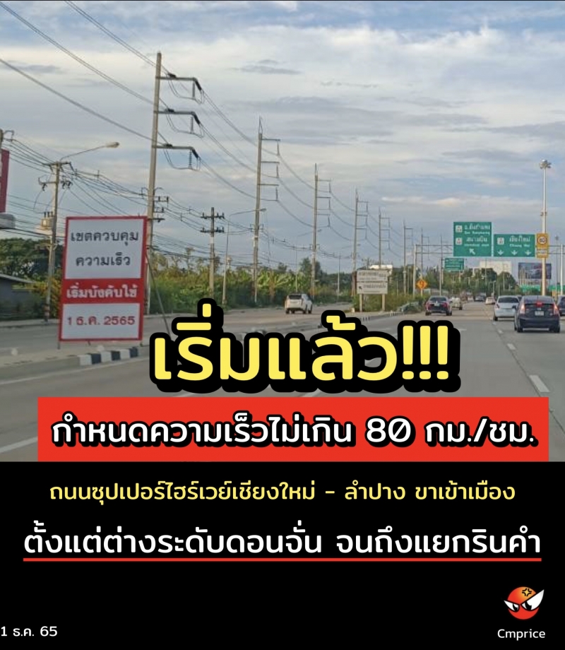 1 ธ.ค. 65 เริ่มแล้ว!!! กำหนดความเร็ว ในเขตทางหลวงและเขตเมือง เพื่อลดการเกิดอุบัติเหตุจากการขับขี่ด้วยความเร็ว กำหนดความเร็ว อยู่ที่ ไม่เกิน 80 กม./ชม. จากปัจจุบันที่กำหนดไว้ ที่ 90 กม./ ชม. ในเส้นทางหลวงหมายเลข 11 ถนนซุปเปอร์ไฮร์เวย์เชียงใหม่ - ลำปาง ขาเข้า เมือง ตั้งแต่ต่างระดับดอนจั่น ไปจนถึงแยกรินคำ