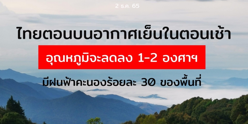 (2 ธ.ค. 65) กรมอุตุนิยมวิทยา พยากรณ์อากาศประจำวัน ภาคใต้ตอนล่างมีฝนเพิ่มขึ้นและมีฝนตกหนักถึงหนักมากบางแห่ง ขอให้ประชาชนในบริเวณดังกล่าวระวังอันตรายจากฝนตกหนักถึงหนักมากและฝนที่ตกสะสมซึ่งอาจทำให้เกิดน้ำท่วมฉับพลันและน้ำป่าไหลหลาก โดยเฉพาะพื้นที่ลาดเชิงเขาใกล้ทางน้ำไหลผ่านและพื้นที่ลุ่มไว้ด้วย