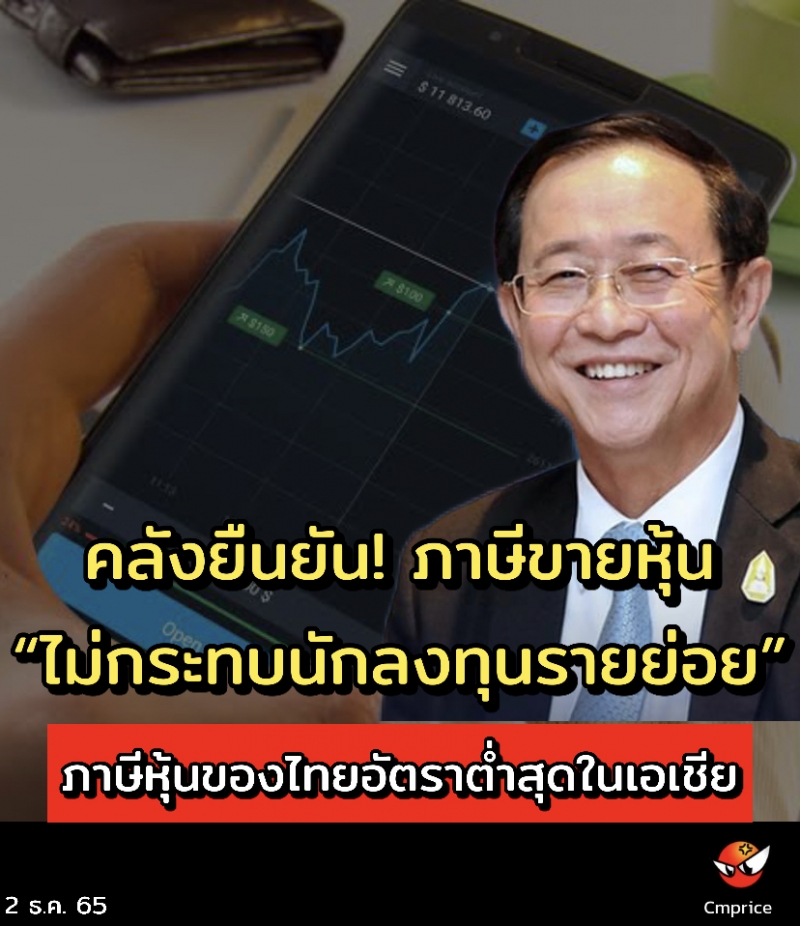 คลัง ยืนยัน การดำเนินการจัดเก็บภาษีขายหุ้นไม่กระทบต่อนักลงทุนรายย่อยอย่างแน่นอน พร้อมระบุว่ามีมูลค่าของตลาดเพียง 5% เท่านั้น ที่สำคัญที่สุดการเก็บภาษีหุ้นของไทยยังถือว่าอยู่ในอัตราต่ำที่สุด ในกลุ่มประเทศในทวีปเอเชีย