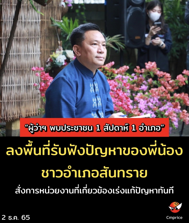 ผู้ว่าราชการจังหวัดเชียงใหม่ ลงพื้นที่รับฟังปัญหาของพี่น้องประชาชนชาวอำเภอสันทราย ตามโครงการ “ผู้ว่าฯ พบประชาชน 1 สัปดาห์ 1 อำเภอ” พร้อมสั่งการให้หน่วยงานที่เกี่ยวข้องเร่งแก้ปัญหาให้ประชาชนในทันที