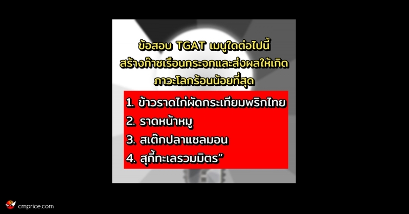 ข้อสอบ TGAT เมนูใดต่อไปนี้สร้างก๊าซเรือนกระจกและส่งผลให้เกิดภาวะโลกร้อนน้อยที่สุด?