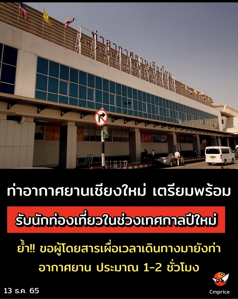 ท่าอากาศยานเชียงใหม่ เตรียมพร้อมรับนักท่องเที่ยวในช่วงเทศกาลปีใหม่ ย้ำ!! ขอผู้โดยสารเผื่อเวลาเดินทางมายังท่าอากาศยาน ประมาณ 1-2 ชั่วโมง เพื่อหลีกเลี่ยงสภาพการจารจรที่คับคั่ง และความแออัดของแถวตรวจบัตรโดยสาร