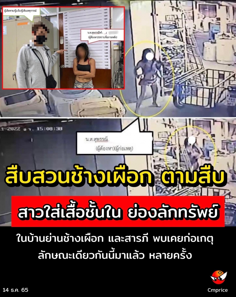 ได้ออกสืบสวนติดตามตัวผู้กระทำความผิด กรณีได้รับแจ้งว่ามี หญิงไม่ทราบชื่อ สวมใส่เพียงแค่เสื้อชั้นใน และกระโปรงสั้น ได้แอบเข้าไปลักทรัพย์ ภายในบ้านเลขที่ 10 ซอย 8 ถนนโชตนา ต.ช้างเผือก อ.เมืองเชียงใหม่จ.เชียงใหม่ เมื่อวันที่ 11 ธ.ค. 2565