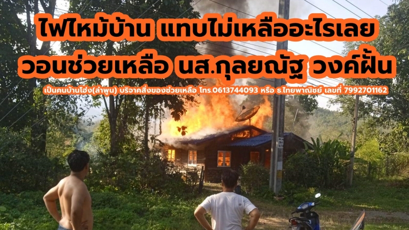| • วอนช่วยเหลือ ไฟไหม้บ้านสาวป่าพลู(ลำพูน) แทบไม่เหลืออะไรเลย โทร. 0613744093 |