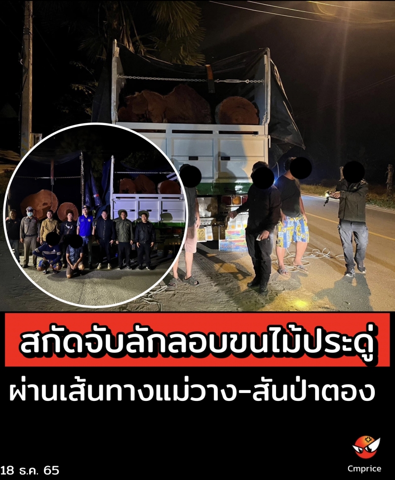 วันที่ 16 ธค 65 เวลา 21.30 น. ถึง วันที่ 17 ธค 65 เวลา 10.30 น. เจ้าหน้าที่หน่วยป้องกันรักษาป่าที่ชม.13 (สันป่าตอง) ได้รับแจ้งว่ามีการลักลอบขนไม้กระยาเลยท่อน (ประดู่) ใส่รถบรรทุกสิบล้อ จำนวน 2 คัน โดยใช้เส้นทางแม่วาง-สันป่าตอง ช่วงแม่วิน-บ้านกาด หลักกิโลเมตรที่ 4