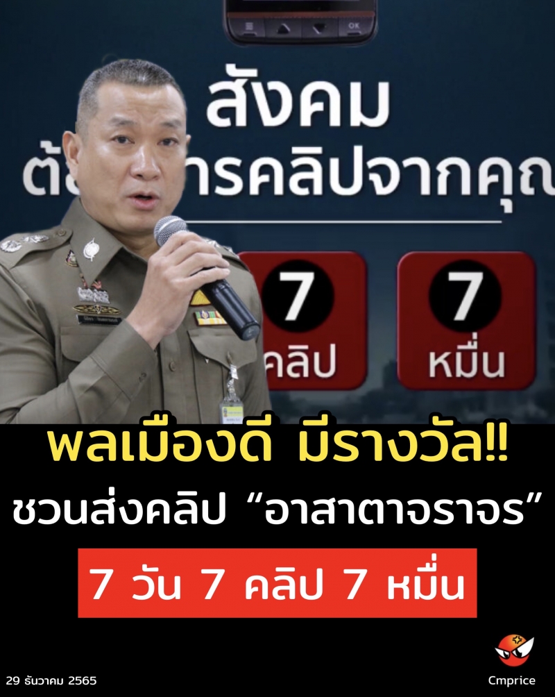 เมื่อวันที่ 28 ธันวาคม 2565 ที่ สำนักงานตำรวจแห่งชาติ (ตร.) พล.ต.ต.นิธิธร จินตกานนท์ รองผู้บัญชาการตำรวจนครบาล ในฐานะหัวหน้าคณะทำงานเสริมสร้างภาพลักษณ์ตำรวจจราจร ศูนย์บริหารงานจราจร สำนักงานตำรวจแห่งชาติ (ศจร.ตร.) ขอเชิญชวนประชาชนร่วมโครงการอาสาตาจราจร “7 วัน 7 คลิป 7 หมื่น” ในช่วงเทศกาลปีใหม่ 2566 ห้วง 7 วันควบคุมเข้มข้น บังคับใช้กฎหมายป้องกันอุบัติเหตุบนท้องถนน
