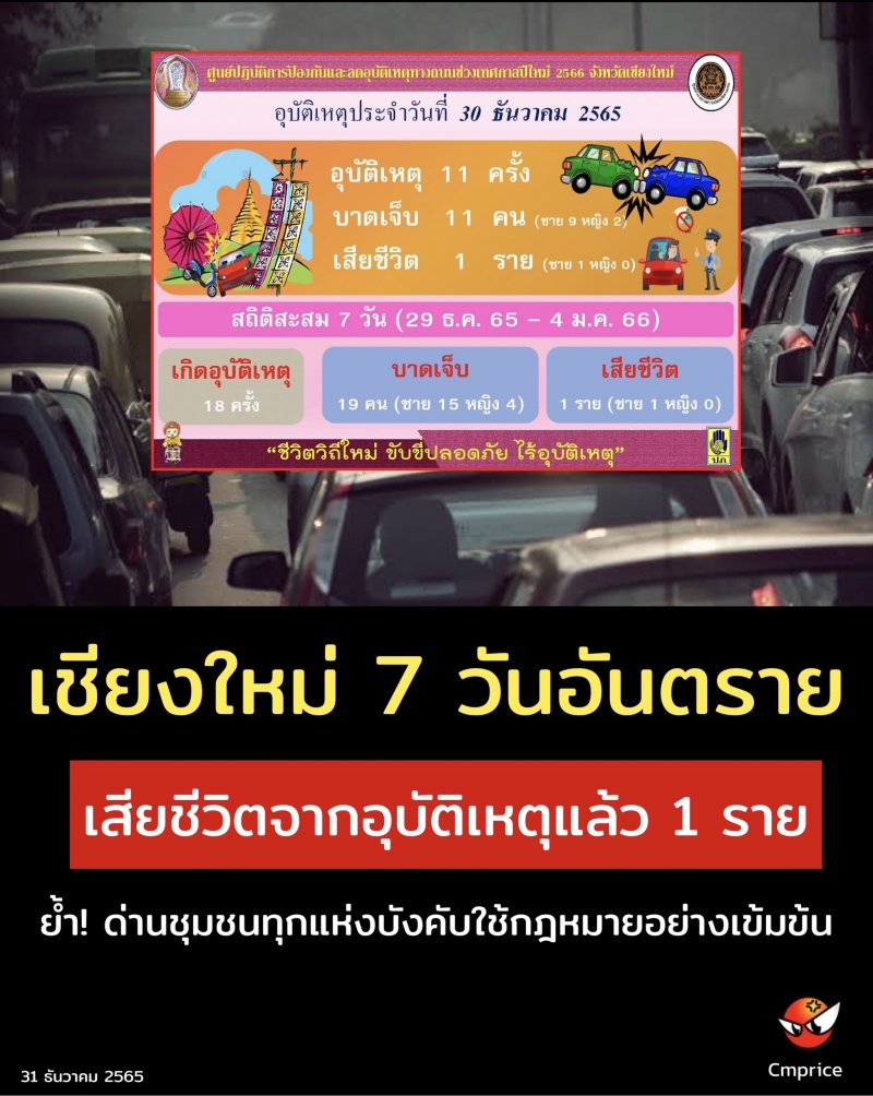 โดยนายอารุณ ปินตา หัวหน้าสำนักงานป้องกันและบรรเทาสาธารณภัยจังหวัดเชียงใหม่ รายงานว่า เมื่อวานนี้ (30 ธันวาคม 2565) จังหวัดเชียงใหม่ มีการเกิดอุบัติเหตุ จำนวน 11 ครั้ง มีผู้บาดเจ็บ 11 คน และมีผู้เสียชีวิต 1 ราย โดยอำเภอที่เกิดอุบัติเหตุสูงสุด คือ อำเภอฮอด, อำเภอดอยเต่า และอำเภอสันทราย อำเภอละ 2 ครั้ง รองลงมาคือ อำเภอสันป่าตอง, อำเภอพร้าว, อำเภอแม่แตง, อำเภอสารภี และอำเภอไชยปราการ อำเภอละ 1 ครั้ง จากการสอบสวนพบว่าสาเหตุหลักยังคงมาจากการเมาสุราแล้วขับ ขับรถตัดหน้ากระชั้นชิด ขับรถเร็วเกินกำหนด และทัศนวิสัยไม่ดี สำหรับประเภทยานพาหนะที่เกิดอุบัติเหตุสูงสุด คือ รถจักรยานยนต์ รถกระบะ และรถยนต์ โดยในช่วง 7 วันอันตราย จังหวัดเชียงใหม่เกิดอุบัติเหตุสะสม 2 วัน จำนวน 18 ครั้ง มีผู้บาดเจ็บ 19 คน และมีผู้เสียชีวิต 1 ราย
