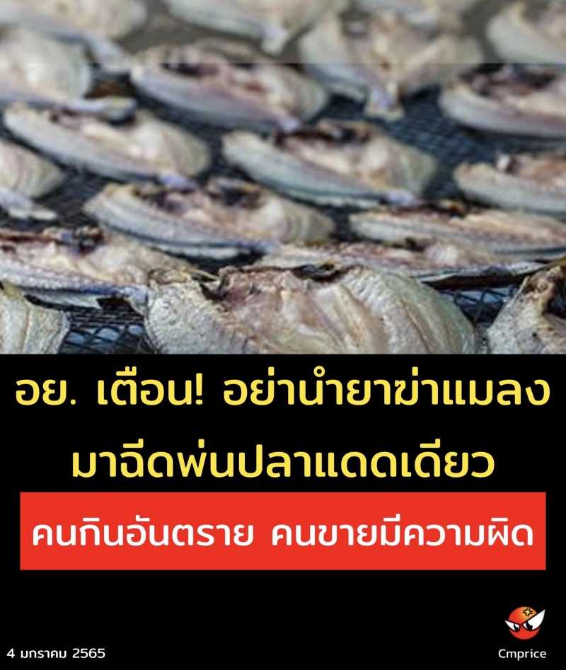 อย. เตือนภัย อย่านำยาฆ่าแมลงมาฉีดพ่นปลาแดดเดียว เพื่อป้องกันแมลงวันตอม คนกินอันตราย คนขายก็มีความผิดด้วย เพราะเป็นการจำหน่ายอาหารไม่บริสุทธิ์ มีโทษทั้งจำทั้งปรับ