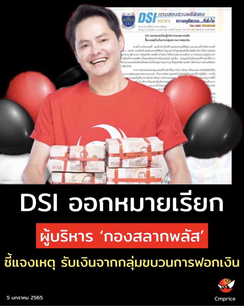 | • DSI ออกหมายเรียก ผู้บริหาร กองสลากพลัส ชี้แจงเหตุ รับเงินจากกลุ่มขบวนการฟอกเงิน |