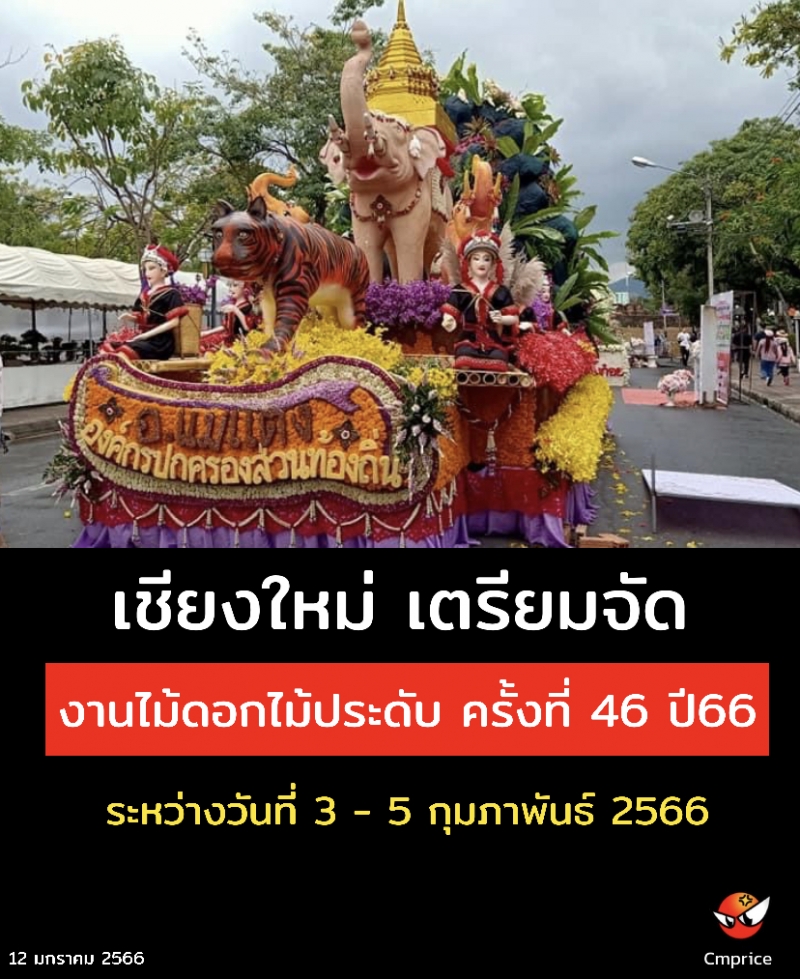 | • เชียงใหม่ เตรียมจัดงานมหกรรมไม้ดอกไม้ประดับ จังหวัดเชียงใหม่ ครั้งที่ 46 ประจำปี 2566 ระหว่างวันที่ 3 - 5 กุมภาพันธ์ 2566 |