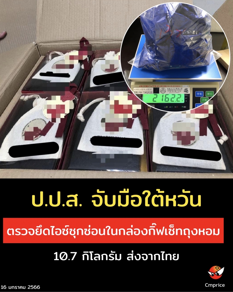 จำนวน 4 กล่อง ที่ส่งจากประเทศไทย และมีปลายทางไปยังไต้หวัน จากการประสานข้อมูลดังกล่าว ไต้หวันจึงตรวจสอบพบ ไอซ์ น้ำหนัก 10.7 กิโลกรัม (บรรจุในกล่องกิ๊ฟเซ็ทถุงหอม)