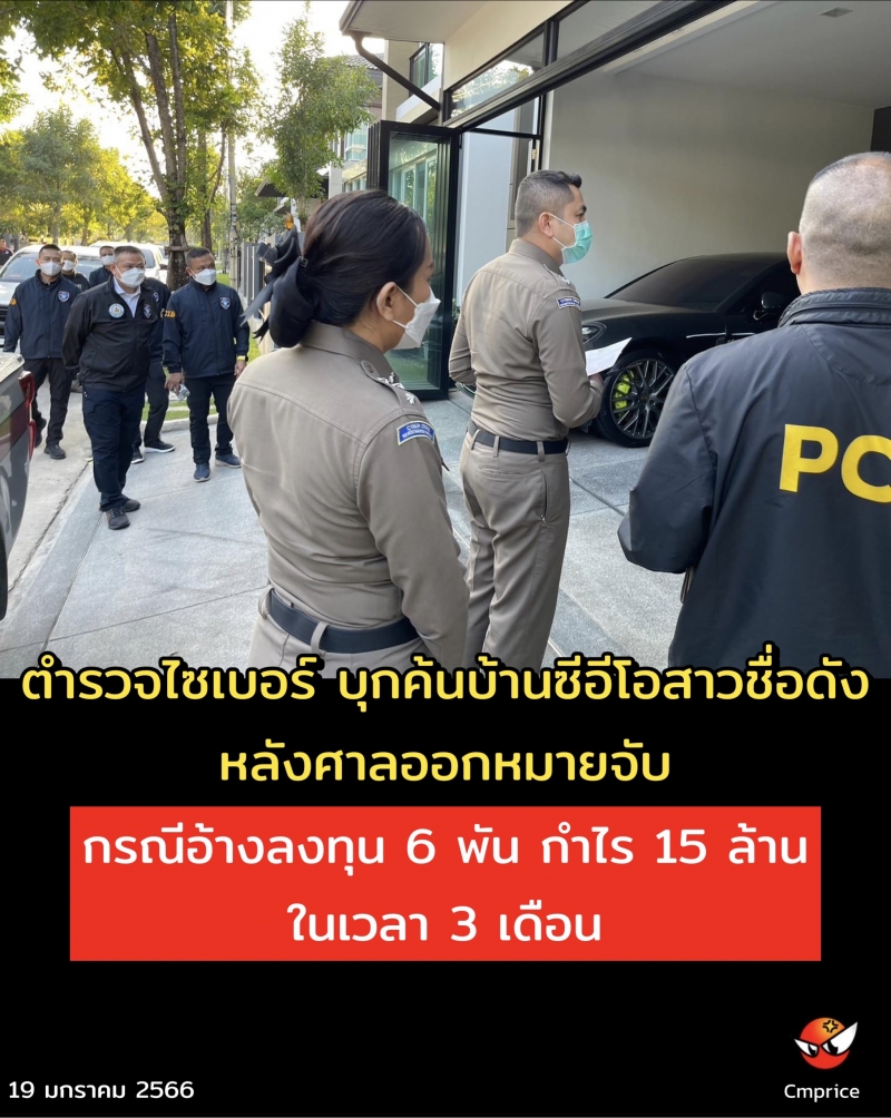 | • ตำรวจไซเบอร์ บุกค้นบ้านซีอีโอสาวชื่อดัง หลังศาลออกหมายจับ กรณีอ้างลงทุน 6 พัน กำไร 15 ล้าน ในเวลา 3 เดือน |