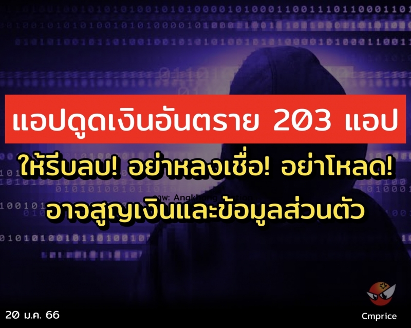 | • ดีอีเอส เปิดรายชื่อ แอปดูดเงินอันตราย 203 แอป เตือนประชาชน ให้รีบลบ! อย่าหลงเชื่อ! อย่าโหลด!อาจสูญเงินและข้อมูลส่วนตัว |