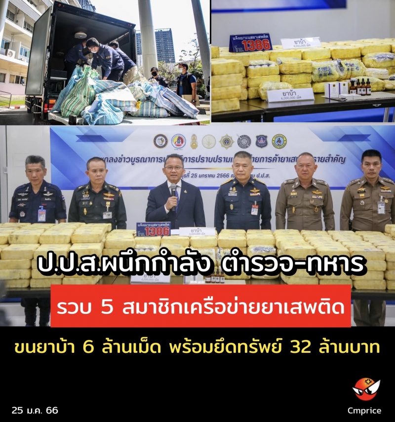 แถลงผลงาน ป.ป.ส.ผนึกกำลัง ตำรวจ-ทหาร รวบ 5 สมาชิกเครือข่ายยาเสพติดขนยาบ้า 6 ล้านเม็ด พร้อมยึดทรัพย์ 32 ล้านบาท