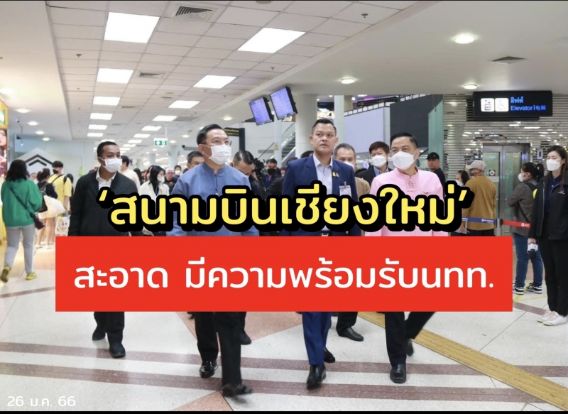 วันนี้ (26 ม.ค. 66) นายธนกร วังบุญคงชนะ รัฐมนตรีประจำสำนักนายกรัฐมนตรี พร้อมด้วย นายนิรัตน์ พงษ์สิทธิถาวรผู้ว่าราชการจังหวัดเชียงใหม่ และนายวิจิตต์ แก้วไทรเทียม ผู้อำนวยการท่าอากาศยานเชียงใหม่ ร่วมตรวจความพร้อมการให้บริการผู้โดยสาร และการอำนวยความสะดวกแก่นักท่องเที่ยว ณ ท่าอากาศยานนานาชาติเชียงใหม่ โดยได้เดินตรวจตั้งแต่เส้นทางผู้โดยสารขาออกจนถึงเส้นทางผู้โดยสารขาเข้าทั้งอาคารผู้โดยสารระหว่างประเทศและในประเทศ