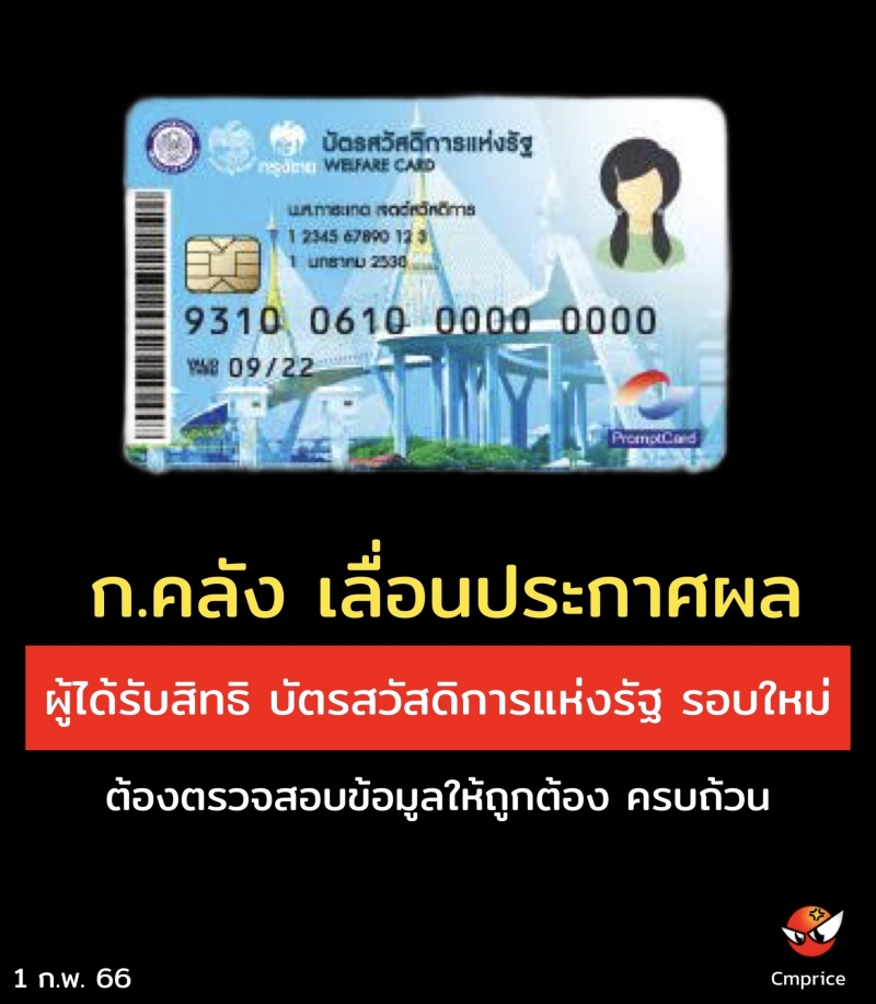| • ก.คลัง แจ้งเลื่อนประกาศผลผู้ได้รับสิทธิ บัตรสวัสดิการแห่งรัฐ รอบใหม่ |