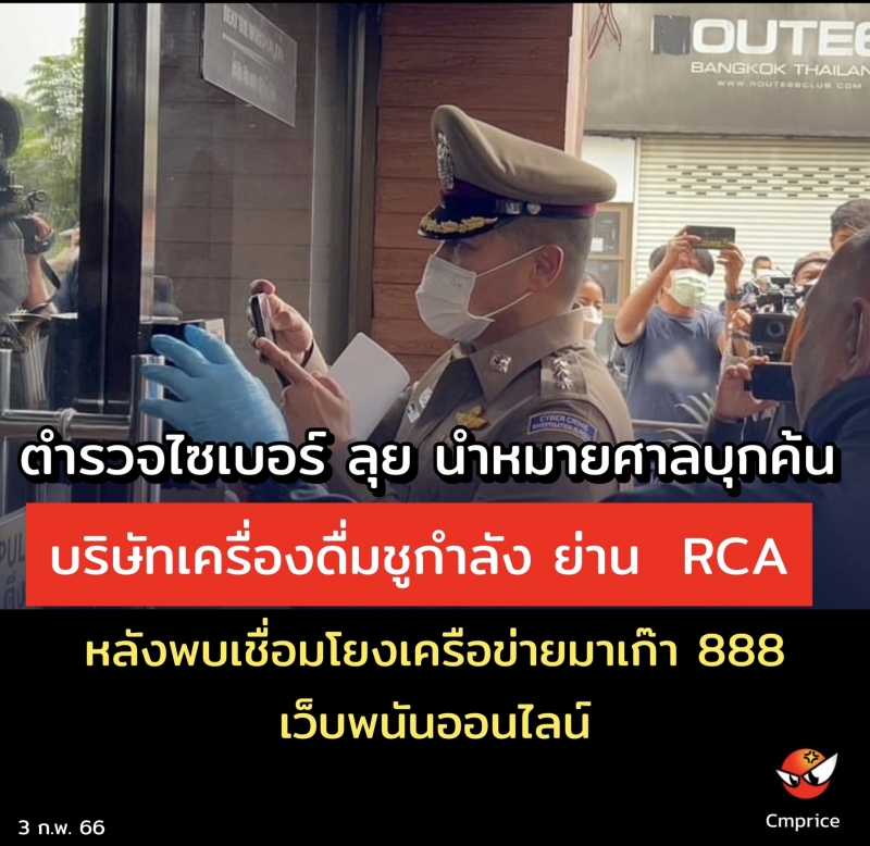 | • ตำรวจไซเบอร์ ลุยต้อง นำหมายศาลบุกค้น บริษัทเครื่องดื่มชูกำลัง ย่าน RCA หลังพบเชื่อมโยงเครือข่ายมาเก๊า 888 เว็บพนันออนไลน์ |