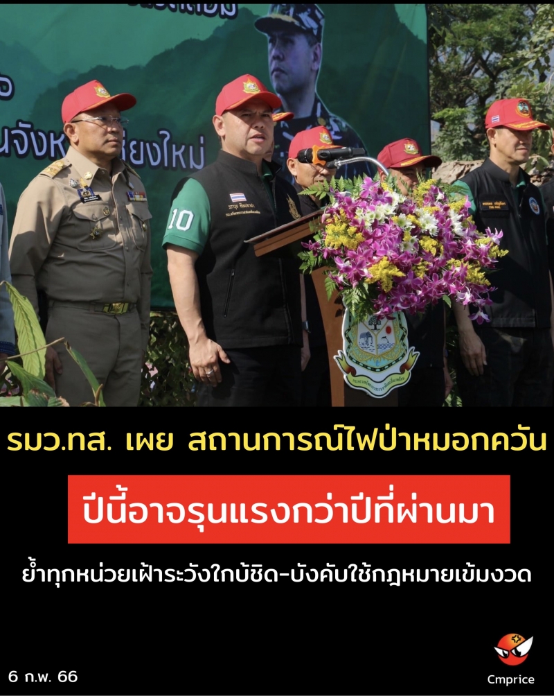 รัฐมนตรีว่าการกระทรวงทรัพยากรธรรมชาติและสิ่งแวดล้อม เผยสถานการณ์ไฟป่าหมอกควันปีนี้อาจรุนแรงกว่าปีที่ผ่านมา กำชับให้มีการกวดขันในพื้นที่โล่งแจ้ง พื้นที่ควบคุมเข้มงวด และพื้นที่ไฟไหม้ซ้ำซาก ย้ำทุกหน่วยงานเฝ้าระวังติดตามย่างใกล้ชิด บังคับใช้กฎหมายอย่างเข้มงวด