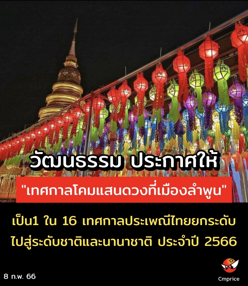 | • กระทรวงวัฒนธรรม ประกาศให้ "เทศกาลโคมแสนดวงที่เมืองลำพูน" เป็น1ใน16 เทศกาลประเพณีไทย |