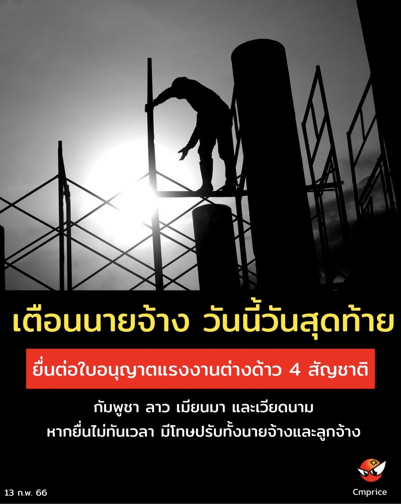 เตือนนายจ้าง 13 กุมภาพันธ์นี้วันสุดท้าย ยื่นต่อใบอนุญาตแรงงานต่างด้าว 4 สัญชาติ
