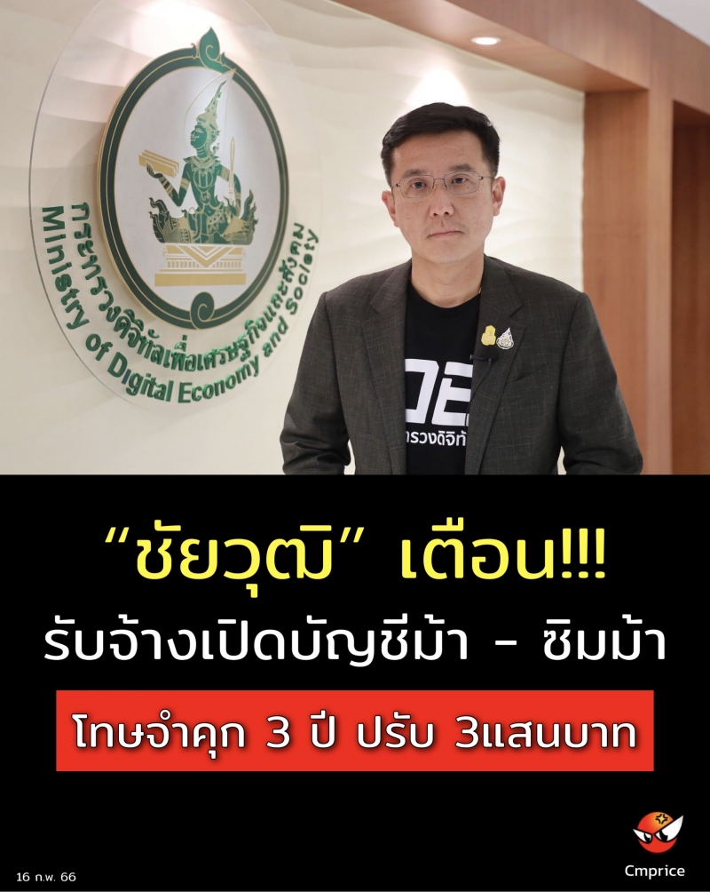 ชัยวุฒิ เตือนรับจ้างเปิดบัญชีม้า - ซิมม้า ระวัง! โทษปรับ-คุก โทษจำคุก 3 ปี ปรับ 300,000 บาท