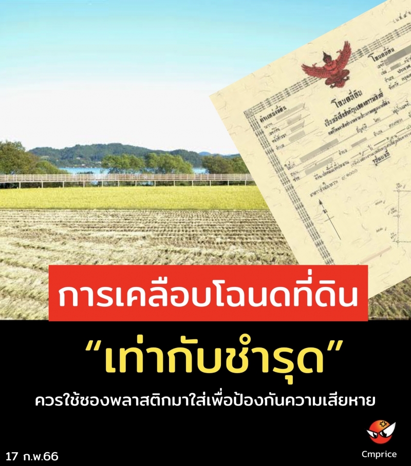 | • ต้องรู้! การเคลือบโฉนดที่ดิน เท่ากับชำรุด ควรใช้ซองพลาสติกมาใส่เพื่อป้องกันความเสียหาย |