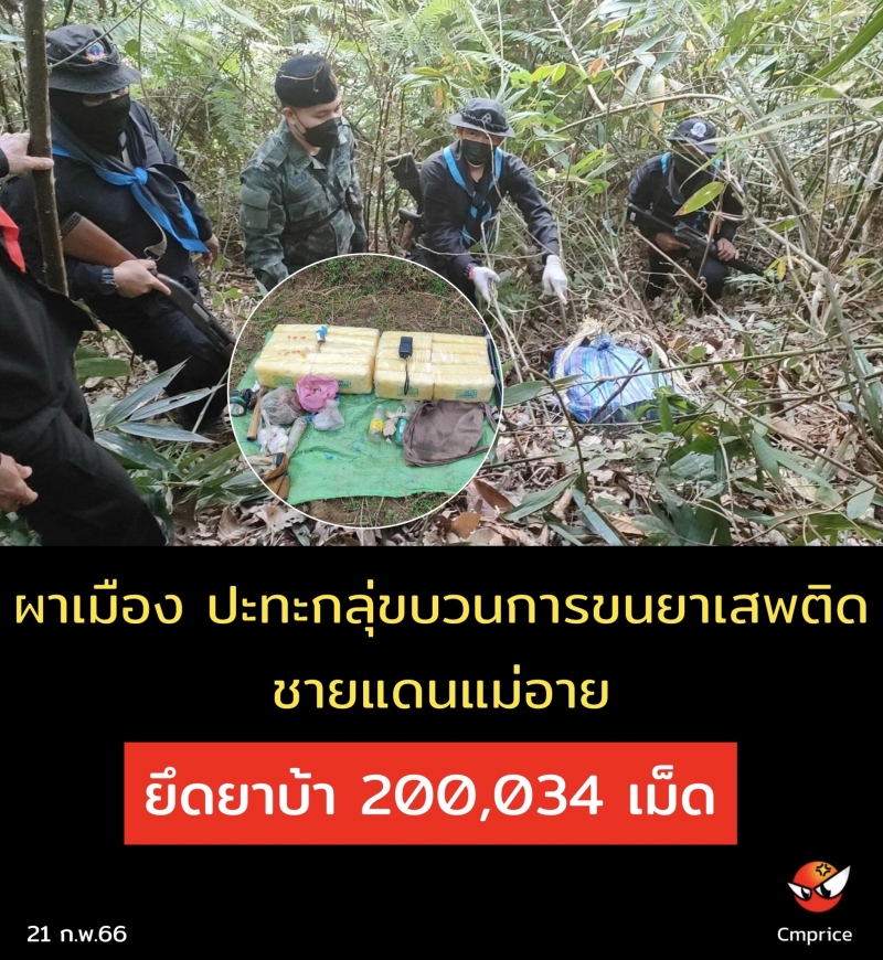 ผาเมือง ปะทะกลุ่มขบวนการขนยาเสพติด ยึดยาบ้า 200,034 เม็ด ชายแดนแม่อาย
