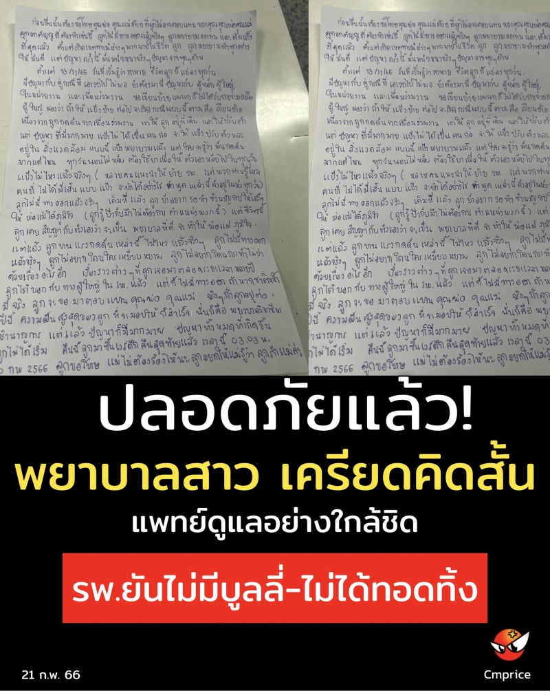 | • ปลอดภัยแล้ว! พยาบาลสาว เครียดคิดสั้น แพทย์ดูแลอย่างใกล้ชิด รพ.ยันไม่มีบูลลี่-ไม่ได้ทอดทิ้ง |