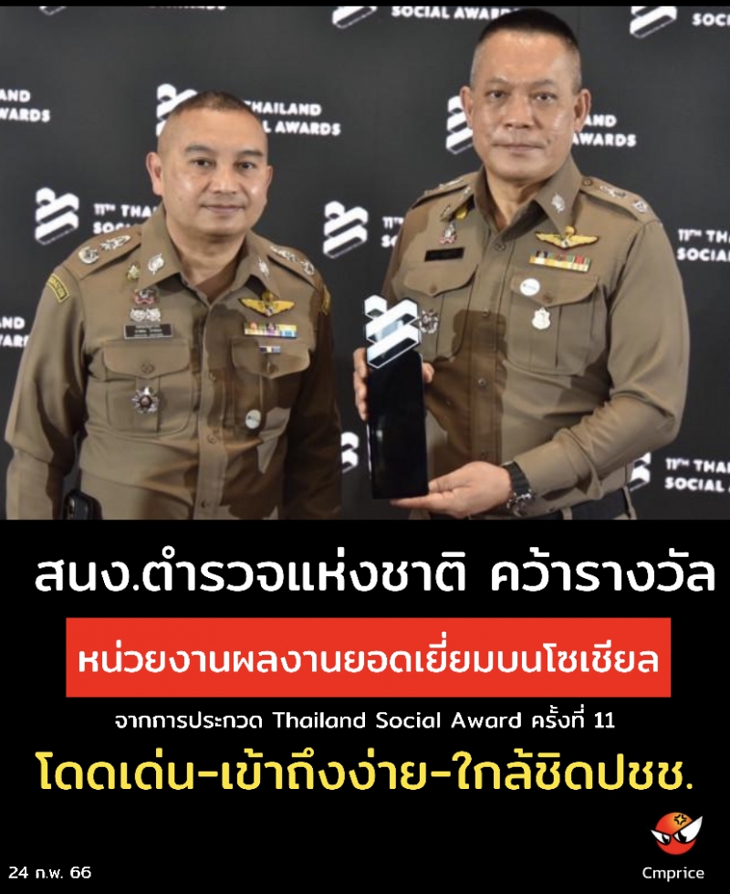 รางวัลผลงานยอดเยี่ยมบนโซเชียลมีเดีย จากกลุ่มหน่วยงานรัฐและรัฐวิสาหกิจทั้ง (Finalist Of Best Brand Performance On Social Media) พิจารณาจากหน่วยงานกว่า 3,000 หน่วย มีหน่วยงานภาครัฐและรัฐวิสาหกิจที่ได้รับรางวัล เช่น การท่องเที่ยวแห่งประเทศไทย ที่ได้รับรางวัลชนะเลิศ ส่วน ตร.ได้รับรางวัล 1 ใน 5 หน่วยงานยอดเยี่ยมร่วมกับ กรมควบคุมโรค วุฒิสภา กระทรวงต่างประเทศ กระทรวงสาธารณสุข ผลสำเร็จของรางวัลดังกล่าวเป็นการขับเคลื่อนตามนโยบาย พล.ต.อ.ดำรงศักดิ์ กิตติประภัสร์ ผบ.ตร.ให้ ตร.สื่อสารทำความเข้าใจกับพี่น้องประชาชนทุกรูปแบบ สร้างการเข้าถึงที่ง่าย ให้ตำรวจกับประชาชนใกล้ชิดกันบนโลกออนไลน์มากยิ่งขึ้น พร้อมช่วยเหลือ ให้คำแนะนำรับฟังปัญหานำมากำหนดเป็นแนวทางการทำงาน ในการดูแลความปลอดภัยในชีวิตและทรัพย์สินของพี่น้องประชาชน
