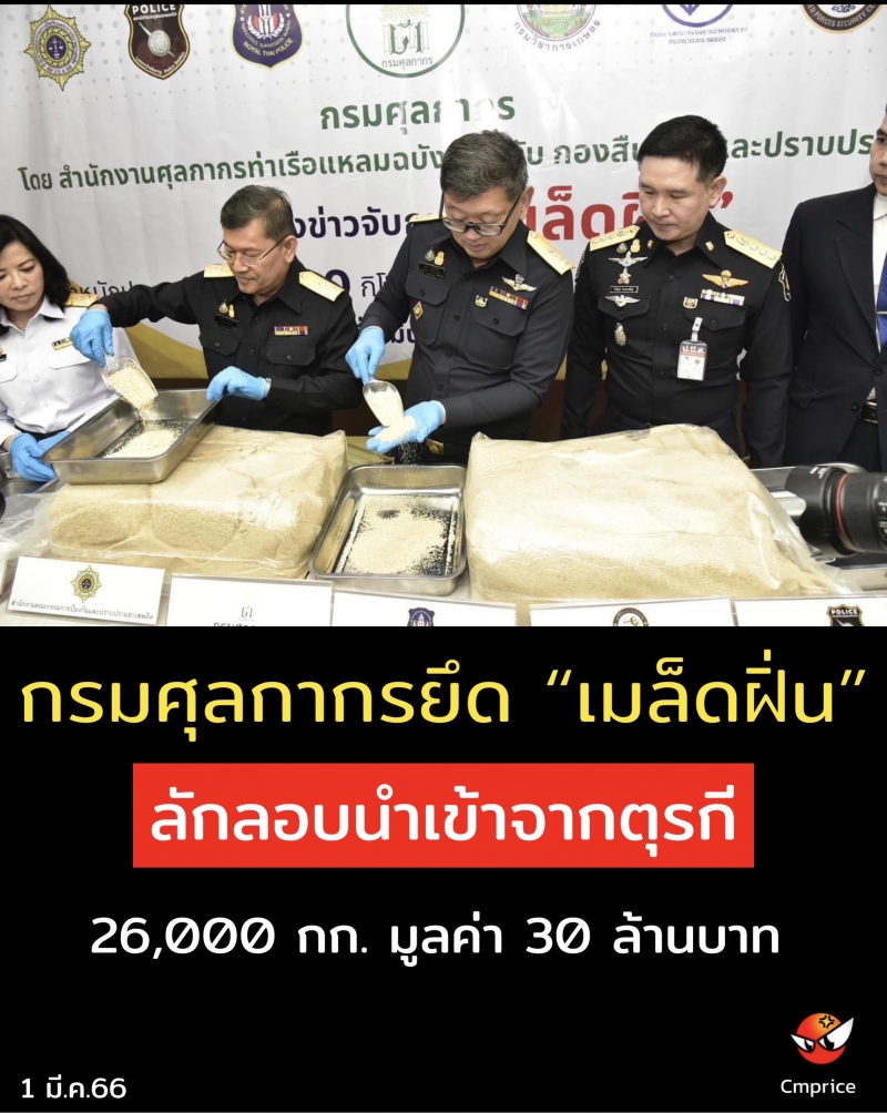 สําหรับวันนี้ (วันที่ 1 มีนาคม 2566) กรมศุลกากร โดยสํานักงานศุลกากรท่าเรือแหลมฉบัง ร่วมกับกองสืบสวนและปราบปราม ตรวจพบใบขนสินค้าขาเข้าสําแดง เป็น งาขาว (WHITE POPPY SEEDS) ประเทศกําเนิด สาธารณรัฐตุรกี น้ําหนัก 26,000 กิโลกรัม เมื่อพิจารณาจากลักษณะทางกายภาพของ สินค้า พบเป็นเมล็ดพืชชนิดหนึ่ง แต่เมื่อเจ้าหน้าที่พิจารณาเอกสารที่เกี่ยวข้องกับการนําเข้าสินค้า เกิดข้อ สงสัยหลายประเด็น เพื่อความชัดเจนจึงชักตัวอย่างสินค้า นําส่งตรวจวิเคราะห์ ณ สถาบันวิชาการและ ตรวจพิสูจน์ยาเสพติด ของสํานักงานคณะกรรมการป้องกันและปราบปรามยาเสพติด (ป.ป.ส.) จากนั้น ป.ป.ส. ได้รายงานผลการตรวจพิสูจน์ตัวอย่างเบื้องต้น พบเป็นมอร์ฟีนและโคเดอีน ซึ่งเป็นแอลคาลอยด์ ในเมล็ดฝิ่น และด่านตรวจพืชท่าเรือแหลมฉบัง แจ้งผลการตรวจสอบสินค้า พบว่า เมล็ดพืชดังกล่าว เป็นเมล็ดของพืชชนิด Papaver somniferum L. อยู่ในวงศ์ Papaverceae (เมล็ดฝิ่น) กรมศุลกากร จึงเปิดตรวจตู้สินค้าดังกล่าว ณ ท่าเรือแหลมฉบังพบเมล็ดฝิ่น จํานวน 26,000 กิโลกรัม มูลค่า 30 ล้านบาท