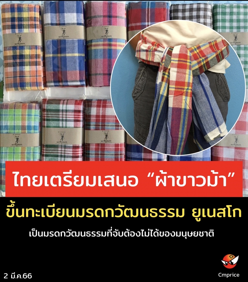 คณะรัฐมนตรี(ครม.) เห็นชอบให้เสนอ ผ้าขาวม้า : ผ้าเอนกประสงค์ในวิถีชีวิตไทย (Pha Khoa Ma : Multifunctional cloths in Thai life) ขึ้นทะเบียนเป็นรายการตัวแทนมรดกวัฒนธรรมที่จับต้องไม่ได้ของมนุษยชาติ ต่อยูเนสโก