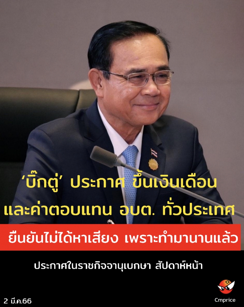 | • บิ๊กตู่ ประกาศ ขึ้นเงินเดือนและค่าตอบแทน อบต. ทั่วประเทศ ประกาศในราชกิจจานุเบกษา สัปดาห์หน้า ยืนยันไม่ได้หาเสียง เพราะทำมานานแล้ว |