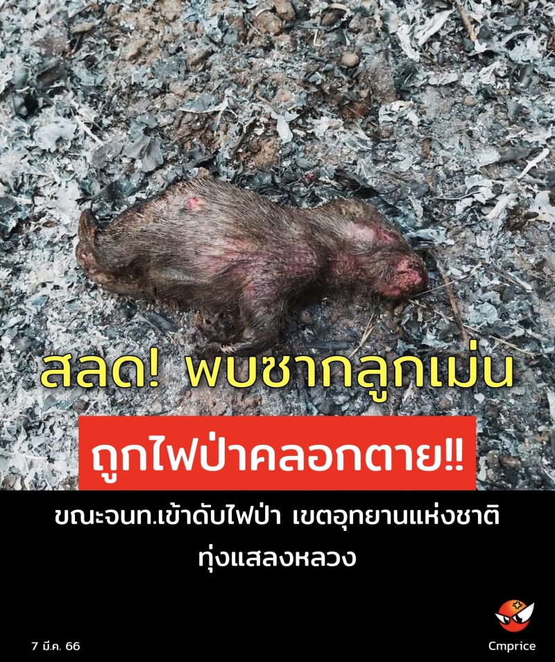 ขณะที่ดับไฟ เจ้าหน้าที่ต้องพบภาพที่น่าหดหู่และสะเทือนใจสุดๆ กับภาพ "ลูกเม่น" ตายคากองเพลิงที่เกิดจากคนจุดไฟเผาป่า นอกจากนี้เจ้าหน้าที่ยังพบรอยสัตว์ป่าอีกหลายชนิด อาทิ หมี เลียงผา เม่น ซึ่งขณะนี้ไฟป่ายังกระจายไหม้ในหลายจุด และเจ้าหน้าที่ทุกภาคส่วนกำลังช่วยกันดับไฟป่าอย่างหนัก เพื่อหวังให้อีกหลายชีวิตที่อาศัยอยู่ในป่าปลอดภัย