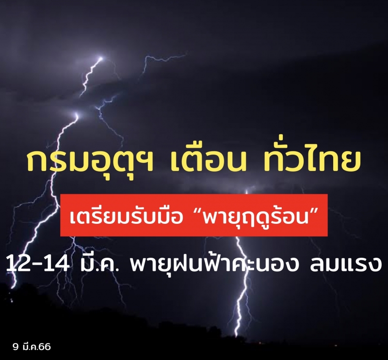 วันนี้ (9 มี.ค.66) เมื่อเวลา 05.00 น. กรมอุตุนิยมวิทยาออกประกาศกรมอุตุนิยมวิทยา เรื่อง "พายุฤดูร้อนบริเวณประเทศไทย ฉบับที่ 1 (71/2566) (มีผลกระทบในช่วงวันที่ 12-14 มีนาคม 2566)" ระบุว่า ในช่วงวันที่ 12-14 มีนาคม2566 บริเวณความกดอากาศสูงหรือมวลอากาศเย็นกำลังปานกลางจากประเทศจีนจะแผ่ลงมาปกคลุมประเทศไทยตอนบนและทะเลจีนใต้ ในขณะที่ประเทศไทยมีอากาศร้อน ประกอบกับคลื่นกระแสลมฝ่ายตะวันตกจะเคลื่อนเข้าปกคลุมภาคเหนือ