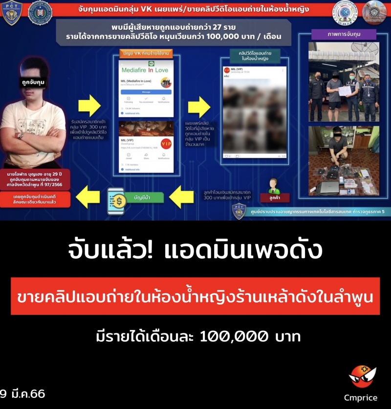 พล.ต.ท.ปิยะ ต๊ะวิชัย ผบช.ภ.5 ได้เปิดเผยว่า ทางเจ้าหน้าที่ตำรวจ ชุด ศูนย์ปราบปรามอาชญากรรมทางเทคโนโลยีสารสนเทศ ตำรวจภูธรภาค 5 (ศปอส.ภ.5 ) ได้รับแจ้งจากพนักงานสอบสวน สภ.เมืองลำพูน จว.ลำพูน ว่าได้รับแจ้งความร้องทุกข์จากหญิงผู้เสียหายหลายรายว่าถูกบุคคลนำรูปภาพและคลิปวีดิโอมีเนื้อหาลามกอนาจารในลักษณะของการถูกแอบถ่ายจากห้องน้ำหญิง ไปเผยแพร่ในสื่อสังคมออนไลน์ VK มีข้อความเชิญชวนผู้ที่สนใจดูคลิปวีดิโอแบบเต็มให้โอนเงินเพื่อสมัครเข้ากลุ่มวีไอพี จำนวน 300 บาท