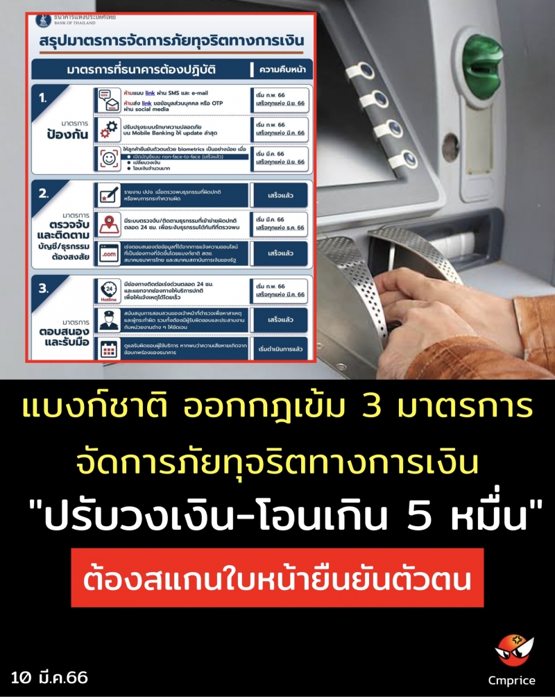 1. มาตรการป้องกัน เพื่อปิดช่องทางที่มิจฉาชีพจะเข้าถึงประชาชนได้มากขึ้น ให้ สง. งดการส่งลิงก์ทุกประเภทผ่านSMS อีเมล และงดส่งลิงก์ขอข้อมูลสำคัญ เช่น ชื่อผู้ใช้งาน รหัสผ่าน และเลขบัตรประชาชนผ่านโซเชียลมีเดีย จำกัดจำนวนบัญชีผู้ใช้งาน mobile banking (username) ของแต่ละ สง. ให้ใช้ได้ใน 1 อุปกรณ์เท่านั้น โดย สง. ต้องจัดให้มีการแจ้งเตือนผู้ใช้บริการ mobile banking ก่อนทำธุรกรรมทุกครั้ง และพัฒนาระบบความปลอดภัยบน mobile banking ให้เท่าทันภัยการเงินรูปแบบใหม่อยู่ตลอดเวลา ตลอดจนต้องยกระดับความเข้มงวดในกระบวนการยืนยันตัวตนขั้นต่ำด้วยการใช้เทคโนโลยีเปรียบเทียบข้อมูลอัตลักษณ์ทางกายภาพของลูกค้า (biometrics) เช่น สแกนใบหน้า ในกรณีลูกค้าขอเปิดบัญชีโดยผ่านแอปพลิเคชันของ สง. (non-face-to-face) หรือทำธุรกรรมผ่าน mobile banking ในเงื่อนไขที่กำหนดไว้ เช่น โอนเงินมากกว่า 50,000 บาท หรือปรับเพิ่มวงเงินทำธุรกรรมต่อวันเป็นตั้งแต่50,000 บาท ขึ้นไป นอกจากนี้ จะกำหนดเพดานวงเงินถอน/โอนสูงสุดต่อวันให้เหมาะสมตามระดับความเสี่ยงของกลุ่มผู้ใช้บริการแต่ละประเภท โดยลูกค้าสามารถขอปรับได้ตามความจำเป็น และต้องยืนยันตัวตนอย่างเข้มงวด