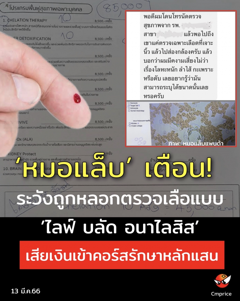 | • หมอแลบ เตือน! ระวังถูกหลอกตรวจเลือดแบบไลฟ์ บลัด อนาไลสิส เสียเงินเข้าคอร์สรักษาหลักแสน |