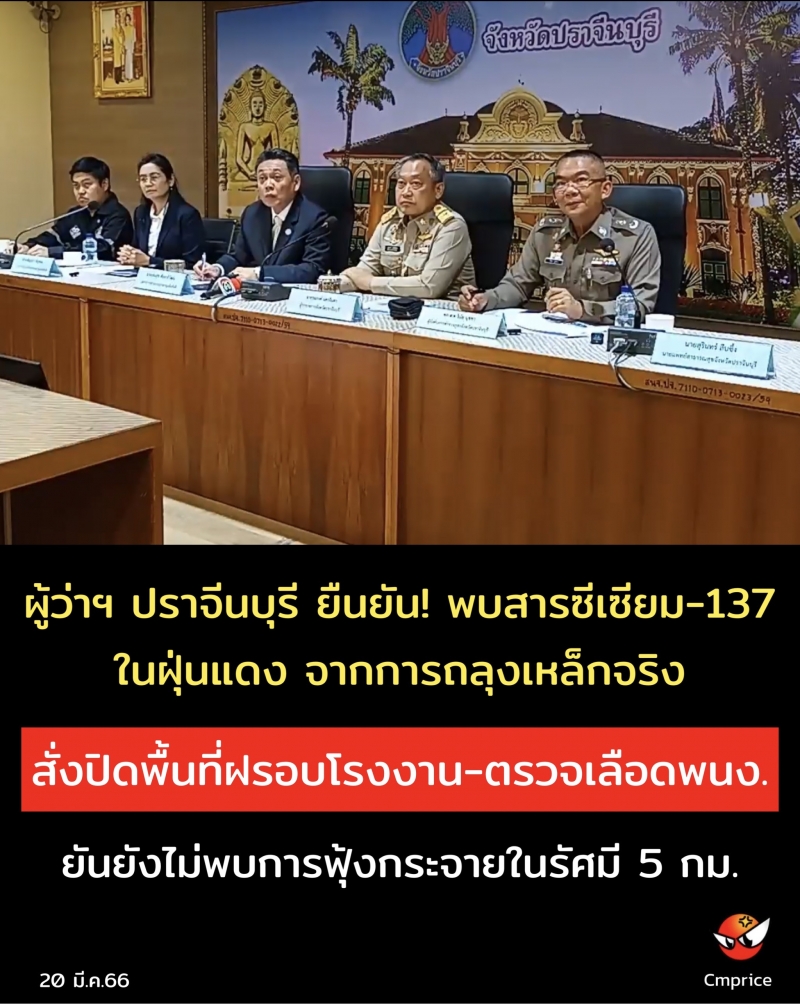 | • ผู้ว่าฯ ปราจีนบุรี ยืนยัน! พบสารซีเซียม-137 ในฝุ่นแดง จากการถลุงเหล็กจริง สั่งปิดพื้นที่โดยรอบโรงงานและตรวจเลือดพนง. |