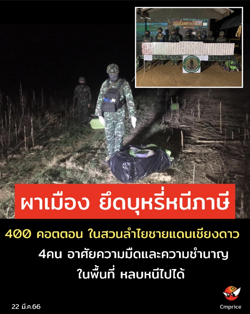 | • ผาเมือง ยึดบุหรี่หนีภาษี 400 คอตตอน ในสวนลำไยชายแดนเชียงดาว |