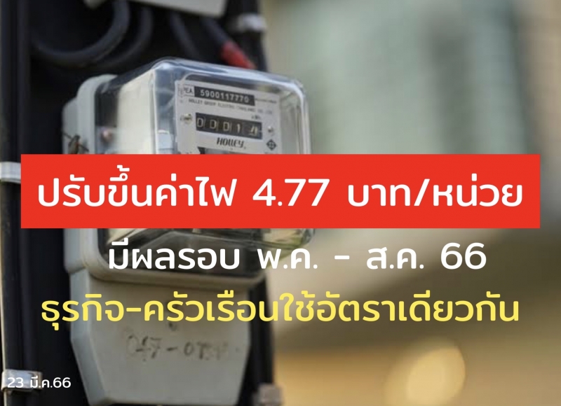 | • กกพ. เคาะค่าไฟงวดใหม่ 4.77 บาท/หน่วย มีผลรอบ พ.ค. - ส.ค. 66ธุรกิจ-ครัวเรือนใช้อัตราเดียวกัน |