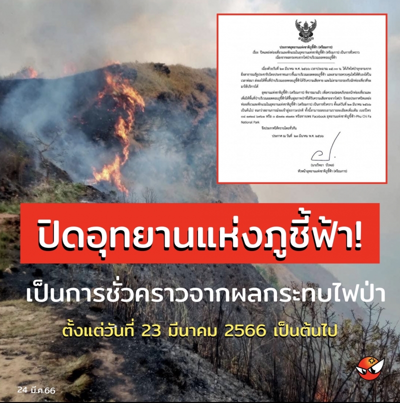 อุทยานแห่งชาติภูชี้ฟ้า (เตรียมการ) อ.เทิง ได้ตรวจสอบพื้นที่พบมีไฟไหม้ส่วนใหญ่เป็นทุ่งหญ้าบริเวณยอดภูชี้ฟ้ากินอาณาบริเวณประมาณ 5 ไร่ ทางนายวิทยา บัวพล หัวหน้าอุทยานฯ จึงได้มีประกาศลงวันที่ 23 มี.ค.2566 ให้ปิดแหล่งท่องเที่ยวและพักแรมในอุทยานแห่งชาติภูชี้ฟ้า (เตรียมการ) เป็นการชั่วคราว