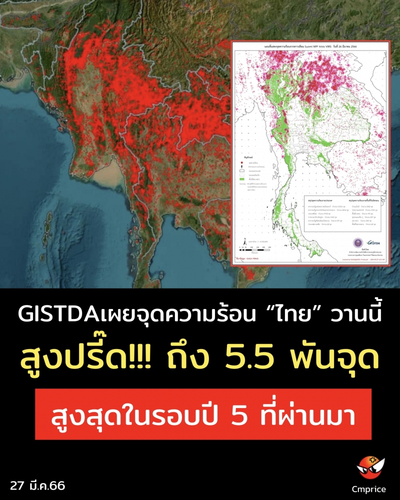 GISTDA เผยข้อมูลจากดาวเทียมซูโอมิ เอ็นพีพี (Suomi NPP) ของวันที่ 26 มีนาคม 2566 ไทยพบจุดความร้อนมากที่สุด  5,572 จุด สูงสุดในรอบปี 5 จากการเก็บสถิติที่ผ่านมา ในขณะที่เพื่อนบ้านอย่างพม่ายังครองแชมป์สูงสุงถึง10,563 จุด ตามด้วย สปป.ลาว 9,652 บาท, กัมพูชา 1,342 จุด, เวียดนาม 870 จุด และ มาเลเชีย 22 จุด