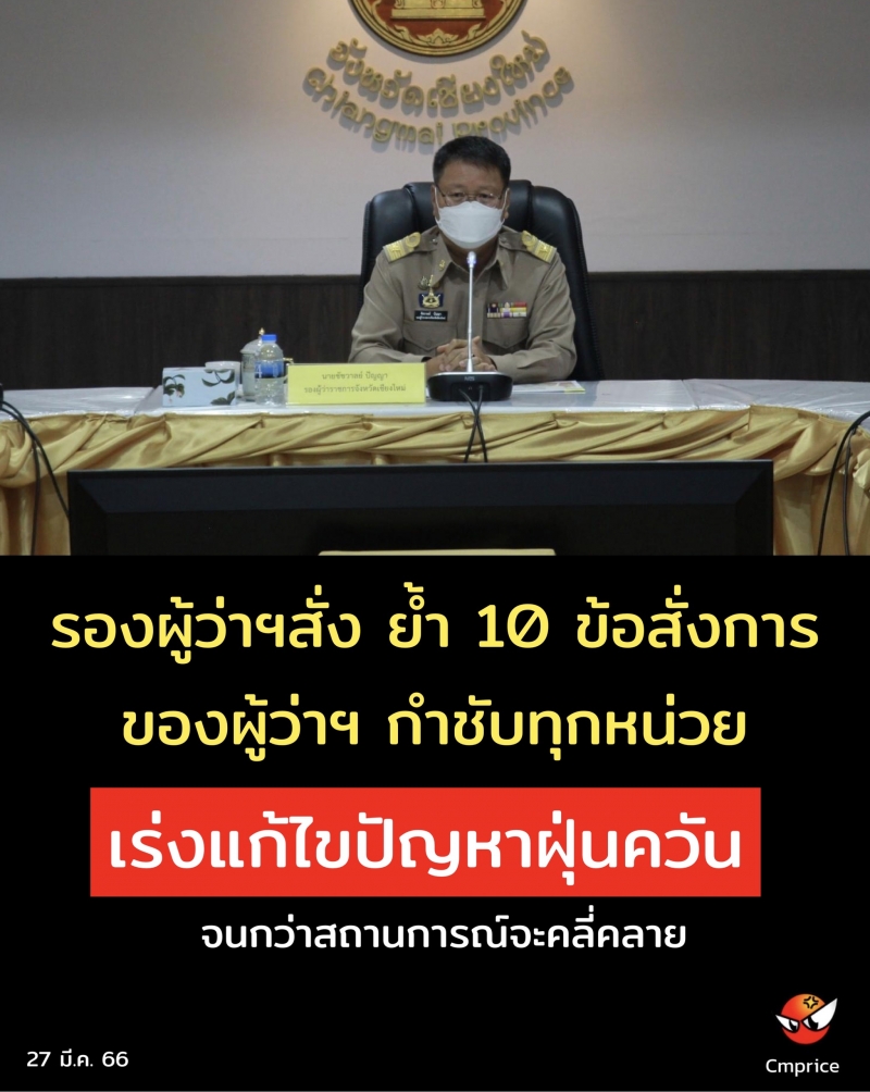 เชียงใหม่ ค่าฝุ่น PM 2.5 เกินมาตรฐาน รองผู้ว่าฯ เน้นย้ำ 10 ข้อสั่งการของผู้ว่าราชการจังหวัดเชียงใหม่ กำชับทุกหน่วยนำไปปฏิบัติเร่งบูรณาการแก้ไขปัญหาฝุ่นควันอย่างเคร่งครัด