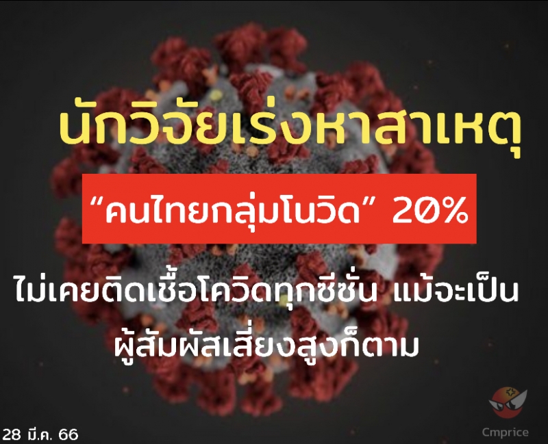 | • นักวิจัย เร่งหาสาเหตุ คนไทยกลุ่มโนวิด (ไม่เคยติดโควิด) 20% ไม่เคยติดเชื้อตลอด 3 ปี แม้จะเป็นผู้สัมผัสเสี่ยงสูงก็ตาม |