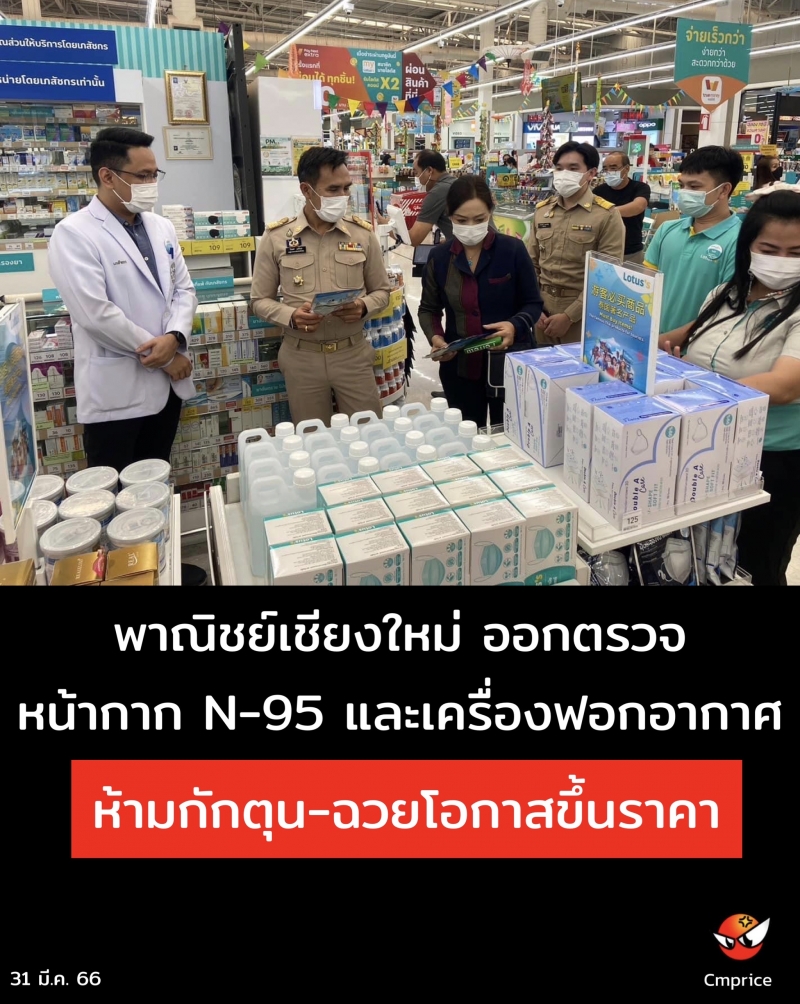 วันนี้ (30 มี.ค. 66) นายนิรัตน์ พงษ์สิทธิถาวร ผู้ว่าราชการจังหวัดเชียงใหม่ มอบหมายให้ นายวีรพงศ์ ฤทธิ์รอด รองผู้ว่าราชการจังหวัดเชียงใหม่ พร้อมด้วย นางนัยนภัส สังขนุกิจ พาณิชย์จังหวัดเชียงใหม่ และนางภูษณิศ ไชยมณีหัวหน้ากลุ่มกำกับและพัฒนาเศรษฐกิจการค้า ลงพื้นที่ติดตามสถานการณ์ด้านปริมาณและราคาสินค้าของหน้ากากอนามัย N-95 และเครื่องฟอกอากาศ ณ ห้างโมเดิร์นเทรด และร้านขายยา ในพื้นที่อำเภอเมืองเชียงใหม่
