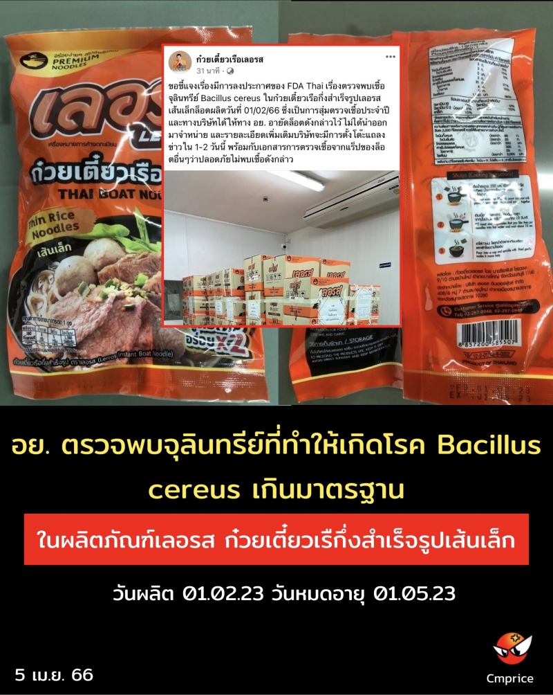 ขอชี้แจงเรื่องมีการลงประกาศของ FDA Thai เรื่องตรวจพบเชื้อจุลินทรีย์ Bacillus cereus ในก๋วยเตี๋ยวเรือกึ่งสำเร็จรูปเลอรส เส้นเล็กล็อตผลิตวันที่ 01/02/66 ซึ่งเป็นการสุ่มตรวจเชื้อประจำปี และทางบริษัทได้ให้ทาง อย. อายัดล็อตดังกล่าวไว้ ไม่ได้นำออกมาจำหน่าย และรายละเอียดเพิ่มเติมบริษัทจะมีการตั้งโต๊ะแถลงข่าวใน 1-2 วันนี้ พร้อมกับเอกสารการตรวจเชื้อจากแร็ปของล็อตอื่นๆว่าปลอดภัยไม่พบเชื้อดังกล่าว