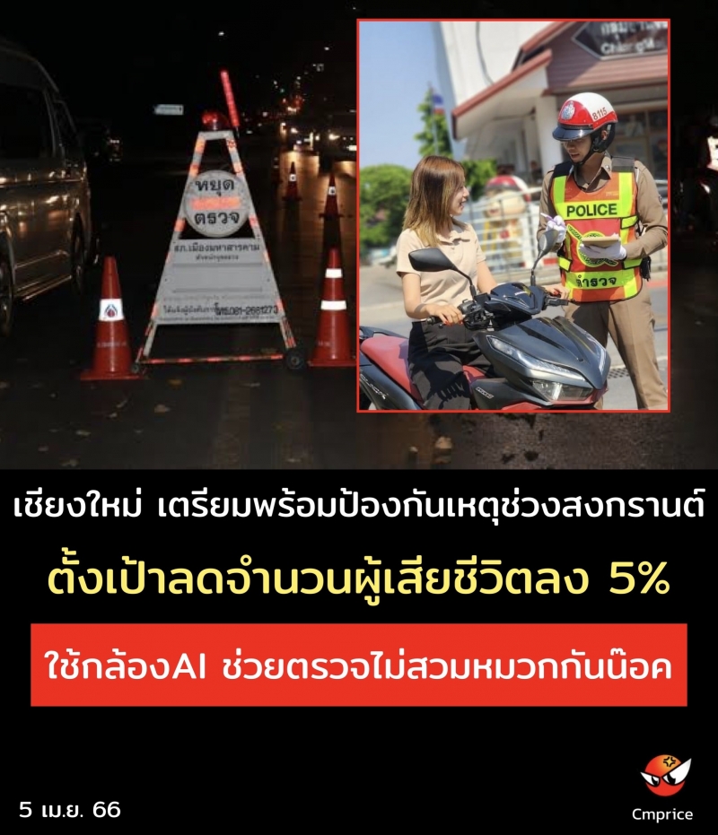 จังหวัดเชียงใหม่ เตรียมความพร้อมป้องกันการเกิดอุบัติเหตุในช่วงเทศกาลสงกรานต์ 2566 ย้ำมาตรการ “10 รสขม” ตั้งเป้าลดจำนวนผู้เสียชีวิตลงร้อยละ 5 พร้อมใช้กล้องอัจฉริยะ (AI) เข้ามาตรวจสอบการกระทำความผิดเรื่องการไม่สวมใส่หมวกนิรภัยขณะขับขี่รถจักรยานยนต์