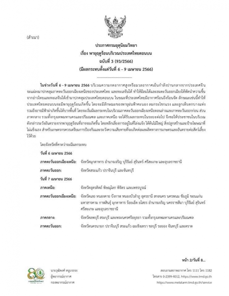 ประกาศ ณ วันที่ 5 เมษายน พ.ศ. 2566 เวลา 17.00 น.กรมอุตุนิยมวิทยาจะออกประกาศฉบับต่อไปใน วันที่ 6 เมษายน พ.ศ. 2566 เวลา 05.00 น.